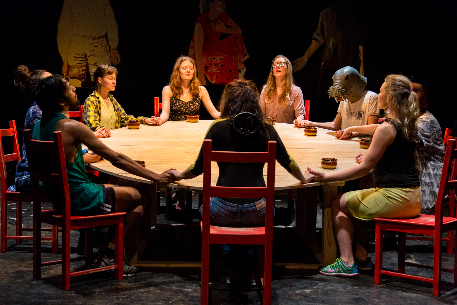 Despite his problems with the show, we managed to find three things that we both admired about the production. First, the music. Catherine Brookman, who plays Hannah, composed the show’s music, and it is really beautiful. Lyrically and stylistically, it reminded me of more traditional folk gospel songs, like Doc Watson’s “Down in the Valley to Pray” or “I’ll Fly Away.” If the show put out a cast recording of the songs, I would very likely buy it. Second, the characters might be thinly written and somewhat unlikeable, but the cast really brings life, personality, and humor to their roles. Brookman is the stand-out because of her singing voice, but everyone is clearly talented. Finally, the set design is imaginative and versatile with the table transforming from a meeting place to the full moon to a cliffside where a character dives into the ocean. An overhead projector is also used to great comedic and artistic effect.