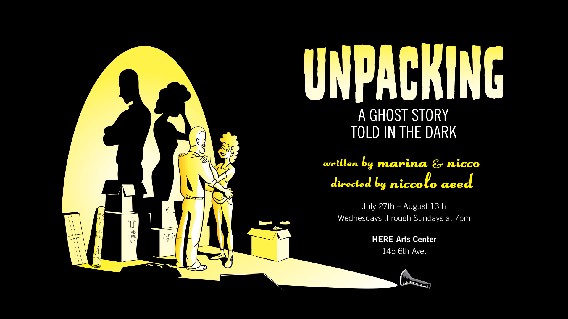 Comedy writing team Marina Tempelsman and Niccolo Aeed’s new show Unpacking: A Ghost Story Told in the Dark opens its run at HERE tonight at 7:00 PM. I was a huge fan of last year’s Room 4, which also featured Unpacking star Temesgen Tocruray, and I couldn’t wait to see what was next from this hilarious and insightful writing team. Before opening night, I sat down with Marina and Nicco to discuss the show’s novel lighting design, developing an on-stage romance, and what scares them off-stage in the real world.