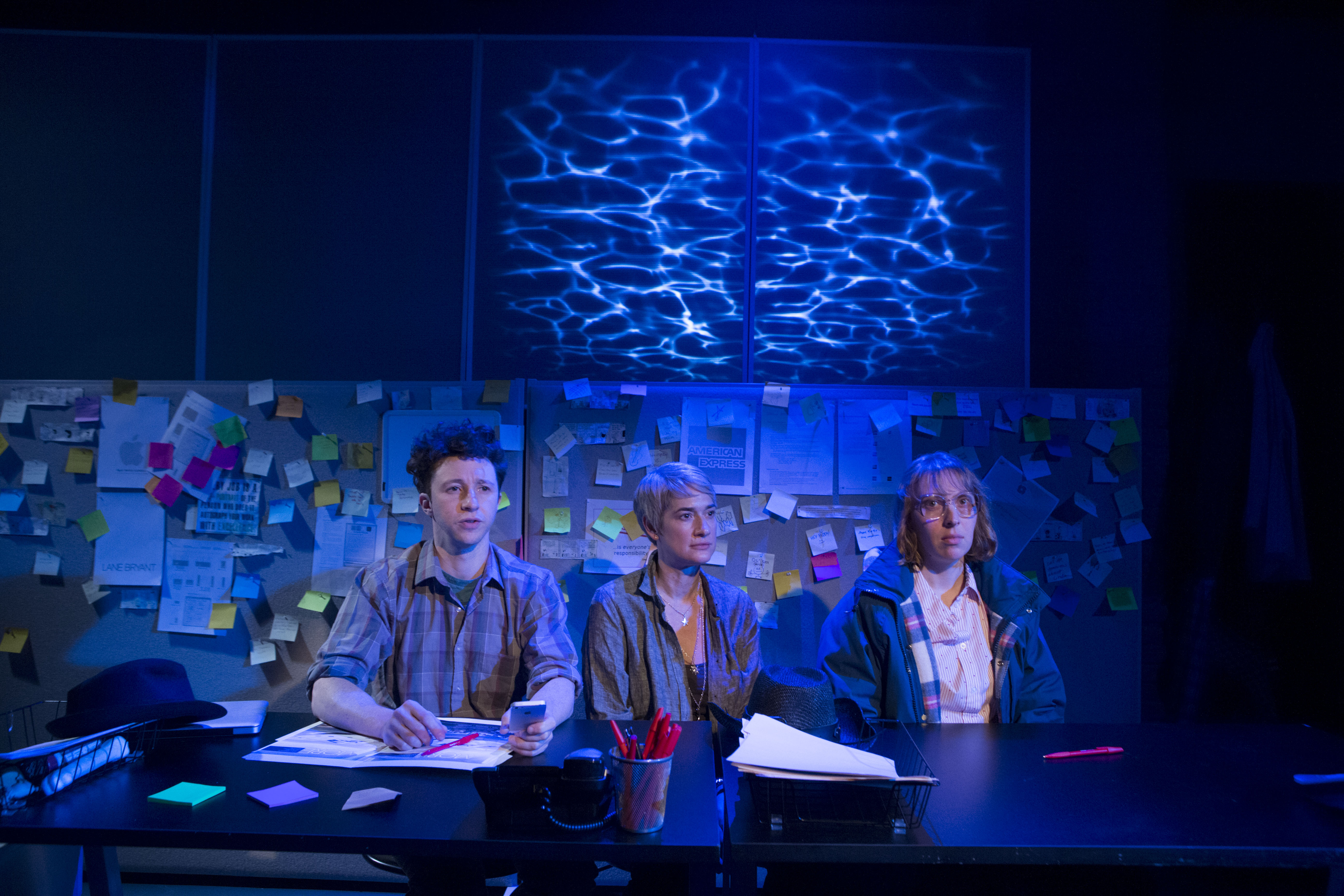 Washed Up on the Potomac, now playing at the Flea Theater’s new Tribeca home, is a dark workplace comedy set in the proofreading office of an ad agency (or possibly purgatory, depending on your interpretation). The show opens with a proofreading disaster in the office, a very obvious and costly mistake on an iPod ad, and the boss is looking for a scapegoat. There is the harried and mousy Sherri (Crystal Finn), who is dominated by her religious fundamentalist mother; Kate (Jennifer Morris), a wannabe rocker who won a songwriting contest at a young age but lost her momentum due to a family tragedy; Mark (Adam Green), a novelist who is so critical of his work that he rewrites the same passage again and again and never finishes anything; and Giorgio (Debargo Sanyal), the office’s self-serious manager who wishes everyone would act a little more professionally.